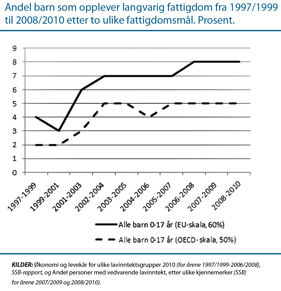- Mer i Fafo-rapporten: Kunnskap om fattigdom i Norge og NOVA-rapporten Barns levekår: Familiens inntekt og barns levekår over tid