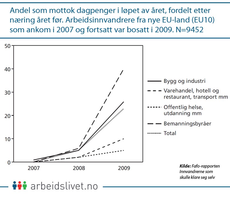 | ANDEL DAGPENGEMOTTAKERE i løpet av året, fordelt etter næring året før. Arbeids-innvandrere fra nye EU-land (EU10) som ankom i 2007 og fortsatt var bosatt i 2009. (klikk for full størrelse) |