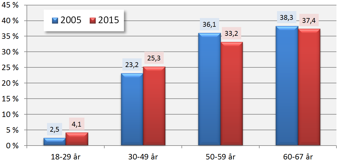 Også gruppen mellom 30 og 49 år utgjør nå en noe større andel – over en fjerdedel av alle uføre: