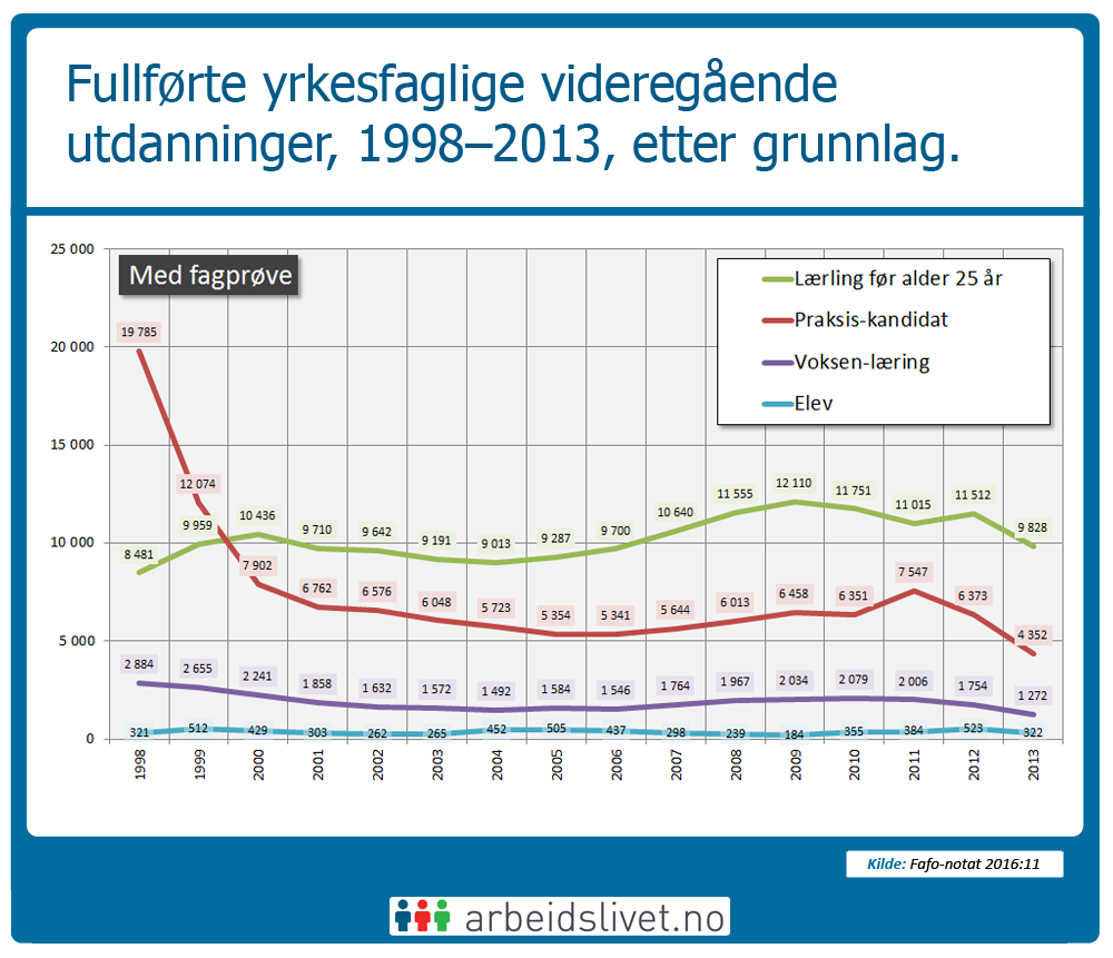 Utviklingen i antallet fagbrev fra 1998 til 2013 finner du i figurene vi har lenket til på høyre side.