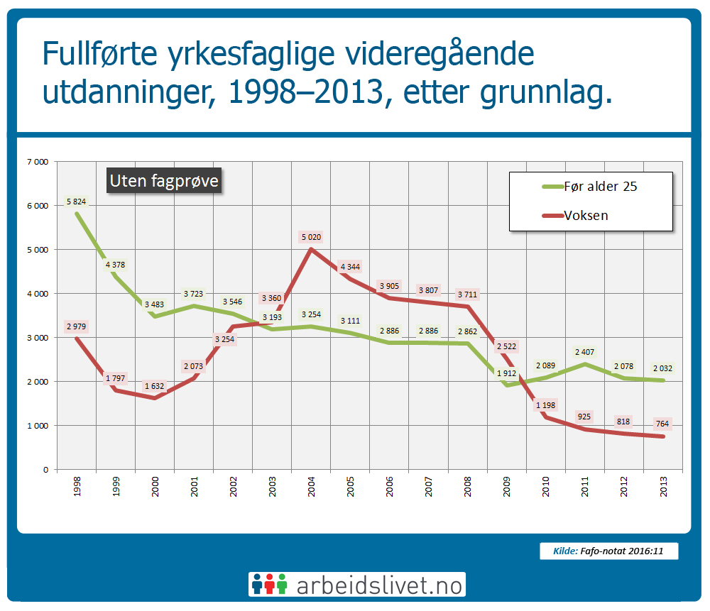 Om lag 150 000 fagbrev har blitt utstedt til voksne i perioden 1998–2013.